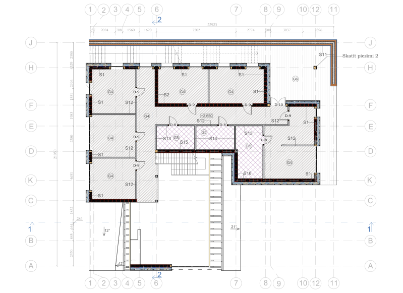 Šeit redzami sienu sastāvi, konstruktīvie elementi, kā arī marķējumi sienām un grīdām.